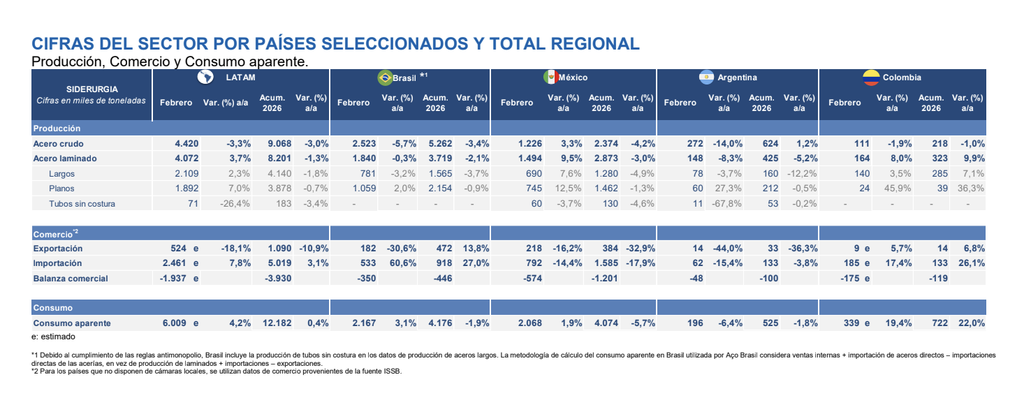 En la región, el consumo aparente de laminados alcanzó 6,0 Mt durante febrero (+4,2% a/a), registrando 12,2 Mt en el acumulado del año con un nivel similar al mismo período de 2025 (+0,4% a/a). El desempeño de los primeros meses del año fue negativo en México, Brasil y Argentina, mientras que Colombia mostró crecimiento.
