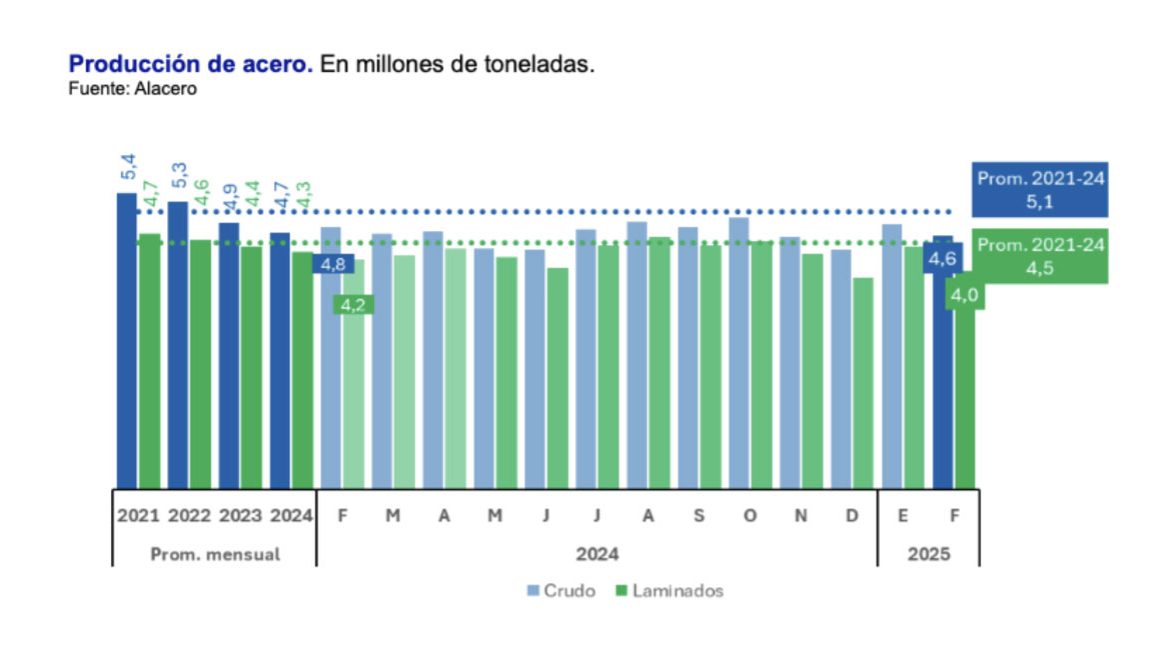 La producción de acero crudo alcanzó las 4,6 Mt en febrero de 2025, marcando una baja interanual de -3,5% -la quinta contracción consecutiva- y acumulando una merma de -3,2% en el primer bimestre del año.