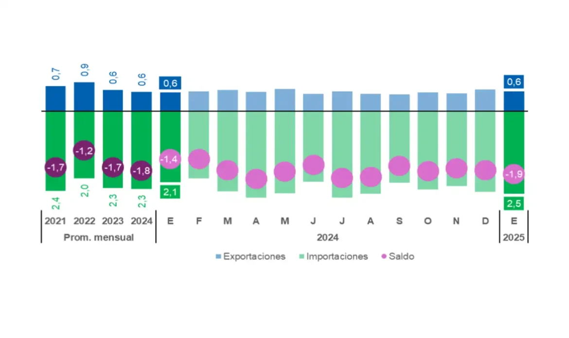 La balanza comercial, durante el primer mes de 2025, arrojó un saldo negativo de 1,9 Mt. Si bien muestra una leve mejoría al de los meses anteriores, se trató del rojo comercial más alto de los últimos 15 años para un mes de enero. Entre las causas, se registra un avance de 16,2 % de las importaciones.