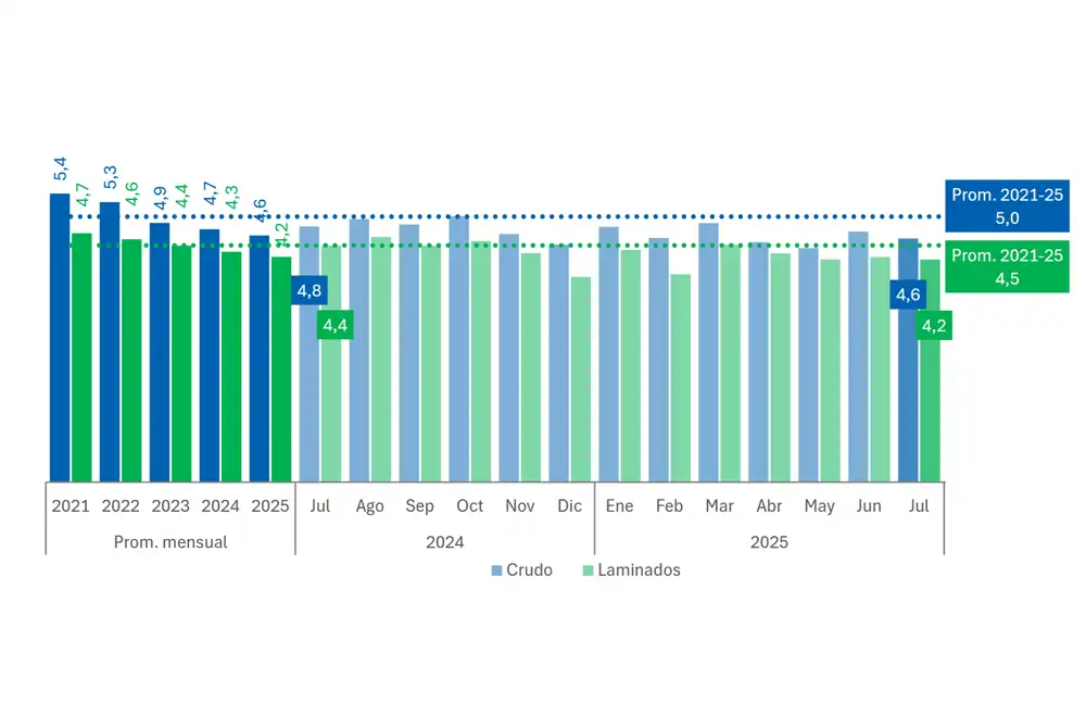 La producción de acero se encuentra en un momento complejo. En julio, la producción de acero crudo fue de 4,6 Mt, un -4,6% interanual y acumulando un -2,0% en lo que va del año. En relación a los laminados, se registraron 4,2 Mt, con un saldo negativo del 5,8%, en comparación con el mismo período del año anterior y un acumulado de -2,0% en 2025.