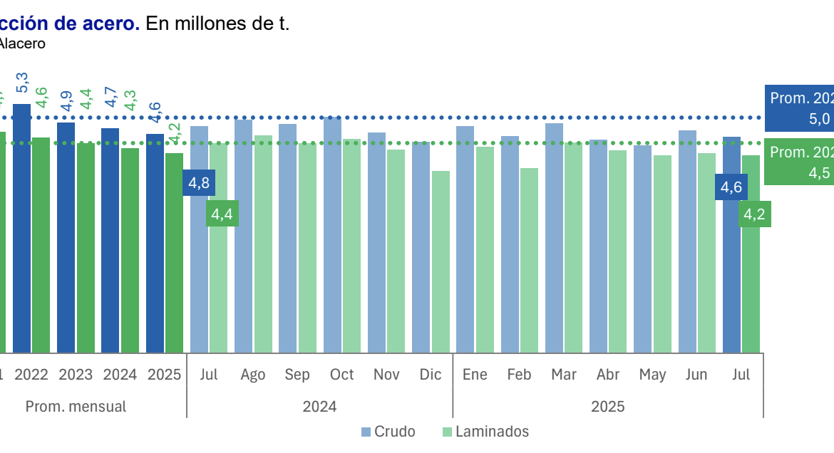 La producción de acero crudo se registró en 4,5 Mt, con una merma interanual de -5,9%, y la de laminados también anotó bajas, tanto en el noveno mes del año (-7,9% a/a) como en el acumulado anual con -3,7%.