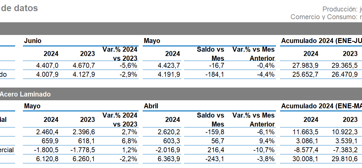 No mês de junho, a produção de aço bruto na América Latina foi de 4.407,0 mil toneladas, registrando uma queda de 0,4% em relação ao mês de maio e 5,6% a menos em comparação com o mesmo período de 2023. Na produção de aço laminado, o total foi de 4.007,9 mil toneladas, uma diminuição de 4,4% em relação ao mês anterior e um decréscimo de 2,9% em comparação a junho de 2023.