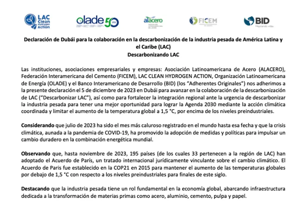 Em um marco histórico, a Alacero aderiu, no âmbito da COP28, à Declaração para a Colaboração na Descarbonização da Indústria Pesada da América Latina e do Caribe...